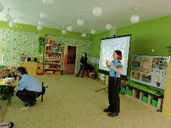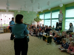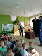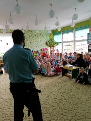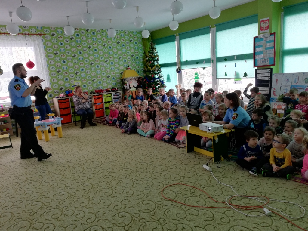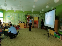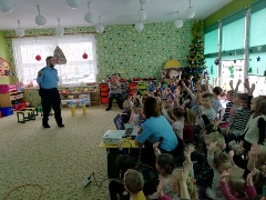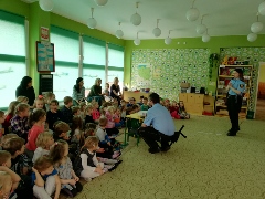 Tematem spotkania było utrwalenie z dziećmi zasad ruchu drogowego oraz przypomnienie zagadnień dotyczących bezpieczeństwa dzieci w przedszkolu i w domu. Pan policjant, w formie praktycznej, przypomniał podstawowe zasady zachowania się podczas przechodzenia przez jezdnię. Następnie wytłumaczył jak należy zachować się w kontaktach z obcymi ludźmi, jak dbać o bezpieczeństwo własne i innych oraz do kogo zwracać się o pomoc w sytuacji zagrożenia. Policjant poinformował i zademonstrował dzieciom również, w jaki sposób należy się zachowywać podczas ataku psa. Dzieci z dużym zainteresowaniem słuchały rad i wskazówek zaproszonego gościa. Na zakończenie wizyty przedszkolaki wręczyły panu policjantowi podziękowanie.(zdjęcia zostały zamieszczone w poszczególnych grupach)