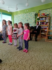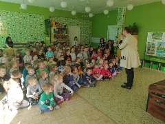 W ramach realizacji akcji "Cała Polska czyta dzieciom" i rozwoju czytelnictwa wśród przedszkolaków grupa maluszków wyruszyła do pobliskiej biblioteki. Tam zapoznały się z regulaminem korzystania z niej, zwiedziły " ogromne zasoby biblioteczne. Dłużej zatrzymały się w kąciku dla dzieci. Bardzo zaciekawiło ich czytane przez panią bibliotekarkę opowiadanie "Bocian i żabka". Na zakończenie przedszkolaki wykleiły rysunek bociana krepą.